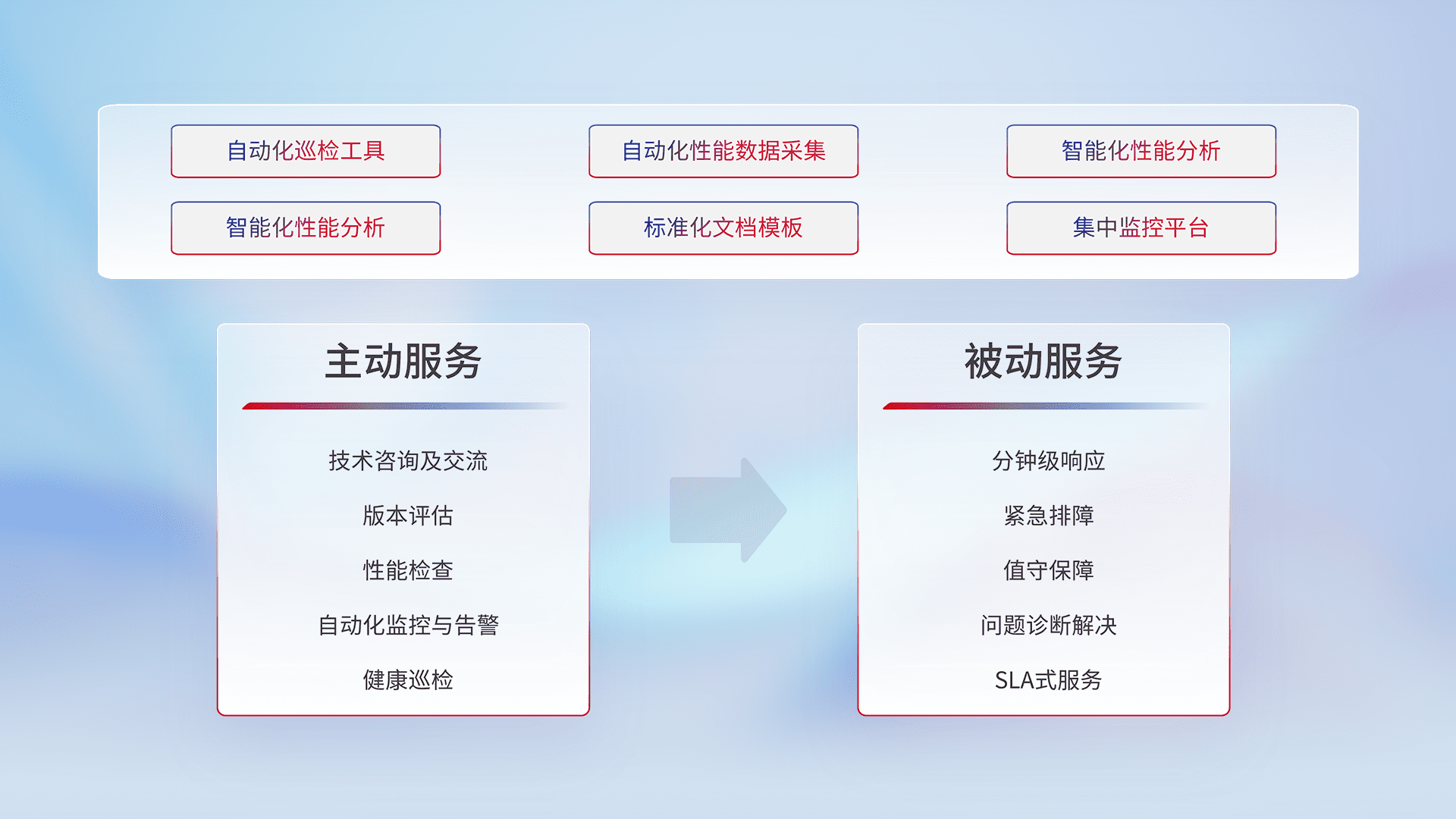 智能化工具和标准化文档,,,保障服务质量,,,,提供主动服务(包含技术咨询、、版本评估、、性能检查、、、、自动化监控与告警、、、健康巡检)和被动服务包含(分钟级响应、、紧急排障、、、值守保障、、、问题诊断解决、、、、SLA服务)。。